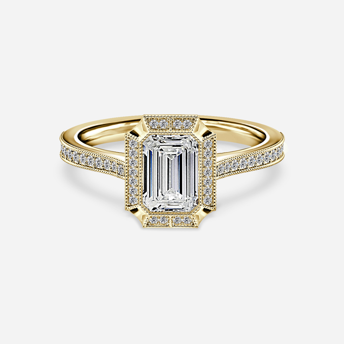 A milgrain bezel set halo engagement ring is a stunning and intricate design featuring a central gemstone encircled by a row of smaller diamonds, all held in place by a delicate milgrain-edged bezel setting.The band is further adorned with shimmering diamonds and milgrain detailing, creating a captivating and timeless symbol of love. Handcrafted in Hatton Garden, London Centre Diamond Not Included Setting Only