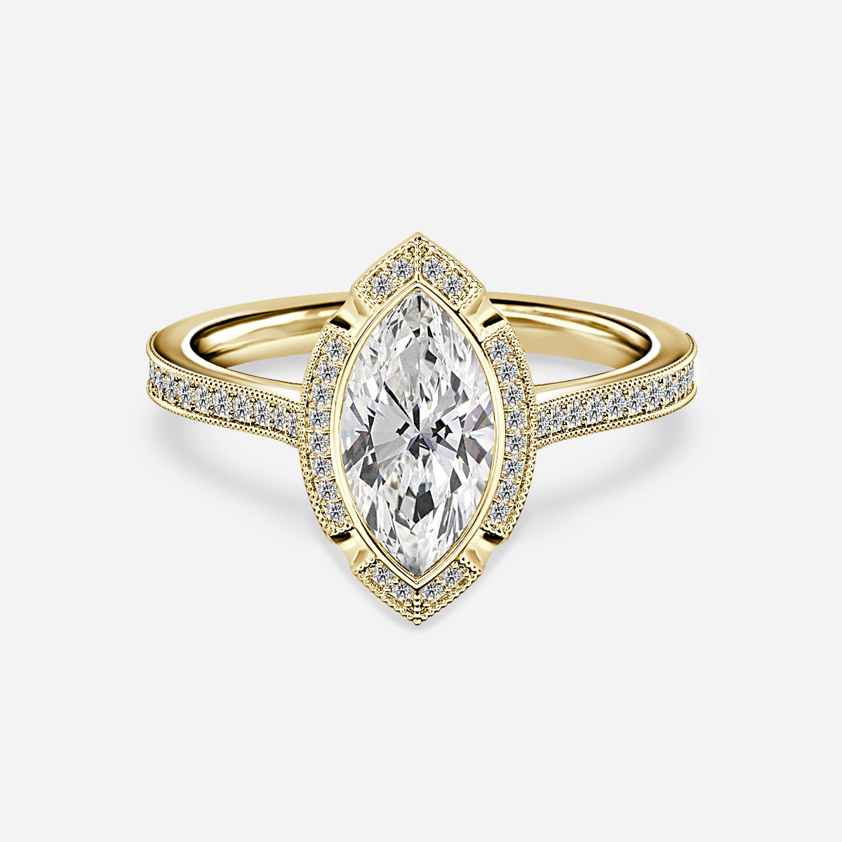 A milgrain bezel set halo engagement ring is a stunning and intricate design featuring a central gemstone encircled by a row of smaller diamonds, all held in place by a delicate milgrain-edged bezel setting.The band is further adorned with shimmering diamonds and milgrain detailing, creating a captivating and timeless symbol of love. Handcrafted in Hatton Garden, London Centre Diamond Not Included Setting Only