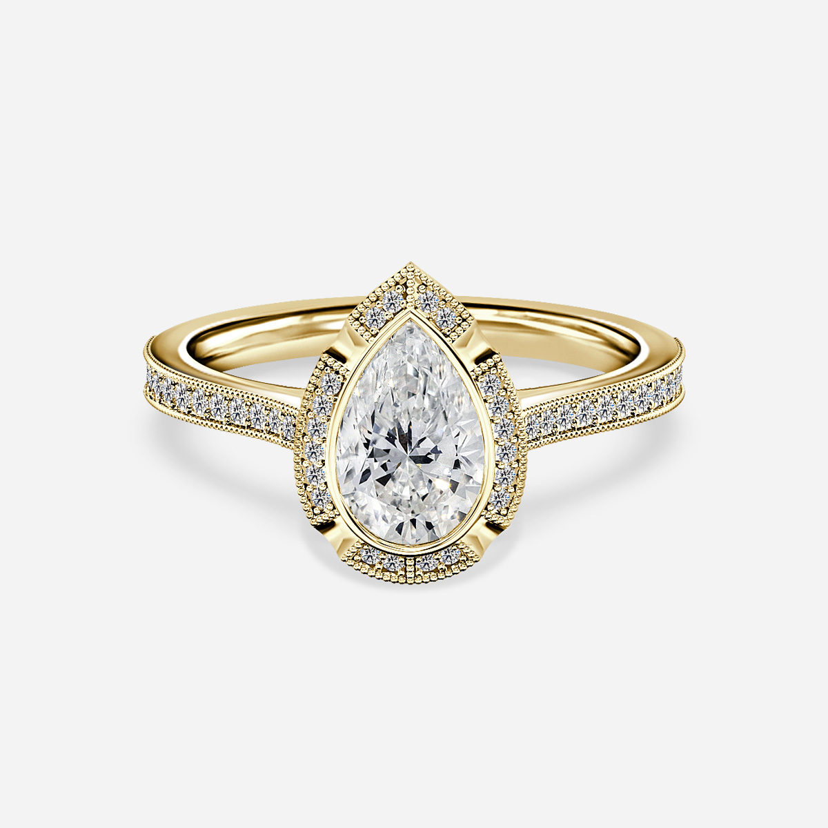 A milgrain bezel set halo engagement ring is a stunning and intricate design featuring a central gemstone encircled by a row of smaller diamonds, all held in place by a delicate milgrain-edged bezel setting.The band is further adorned with shimmering diamonds and milgrain detailing, creating a captivating and timeless symbol of love. Handcrafted in Hatton Garden, London Centre Diamond Not Included Setting Only