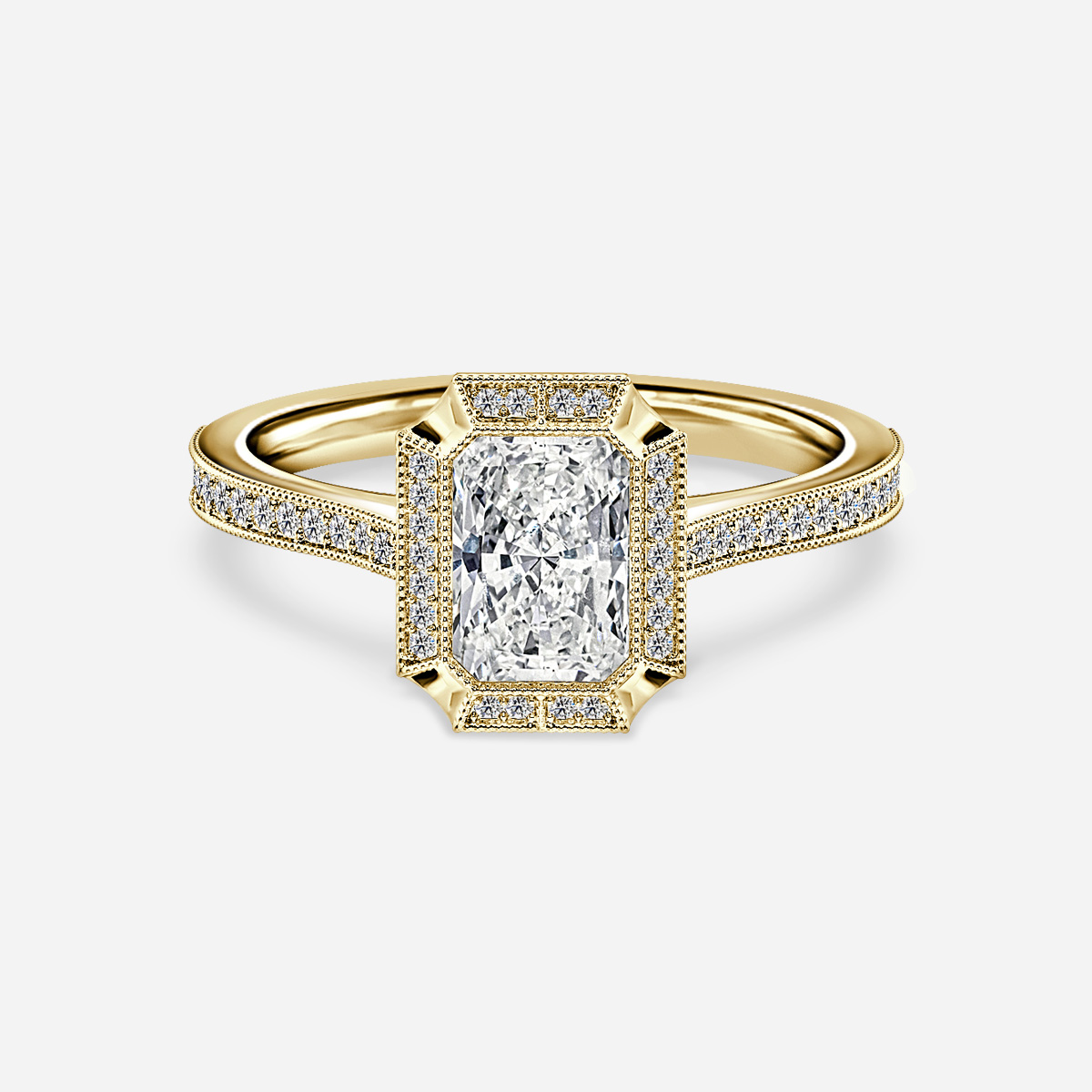 A milgrain bezel set halo engagement ring is a stunning and intricate design featuring a central gemstone encircled by a row of smaller diamonds, all held in place by a delicate milgrain-edged bezel setting.The band is further adorned with shimmering diamonds and milgrain detailing, creating a captivating and timeless symbol of love. Handcrafted in Hatton Garden, London Centre Diamond Not Included Setting Only
