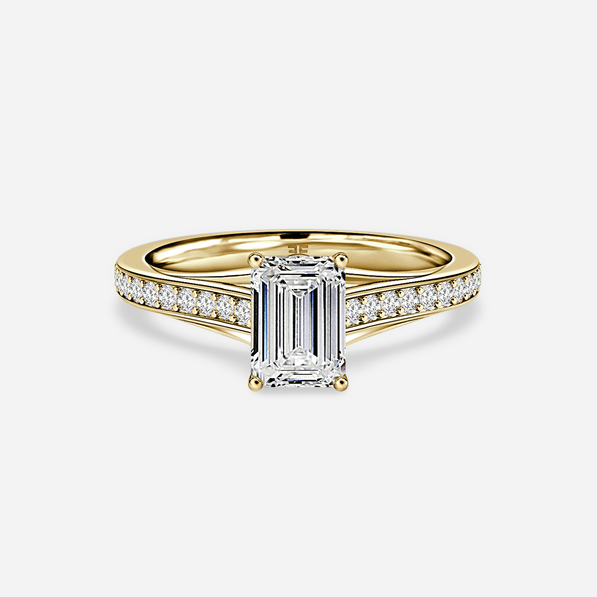 A yellow gold cathedral design engagement ring in pave features a raised setting that arches over the center stone, with multiple small stones set into the band in a pavé setting style. This ring design resembles the architecture of a cathedral and adds a touch of elegance and sparkle to the ring. Handcrafted in Hatton Garden, London Centre Diamond Not Included Setting Only