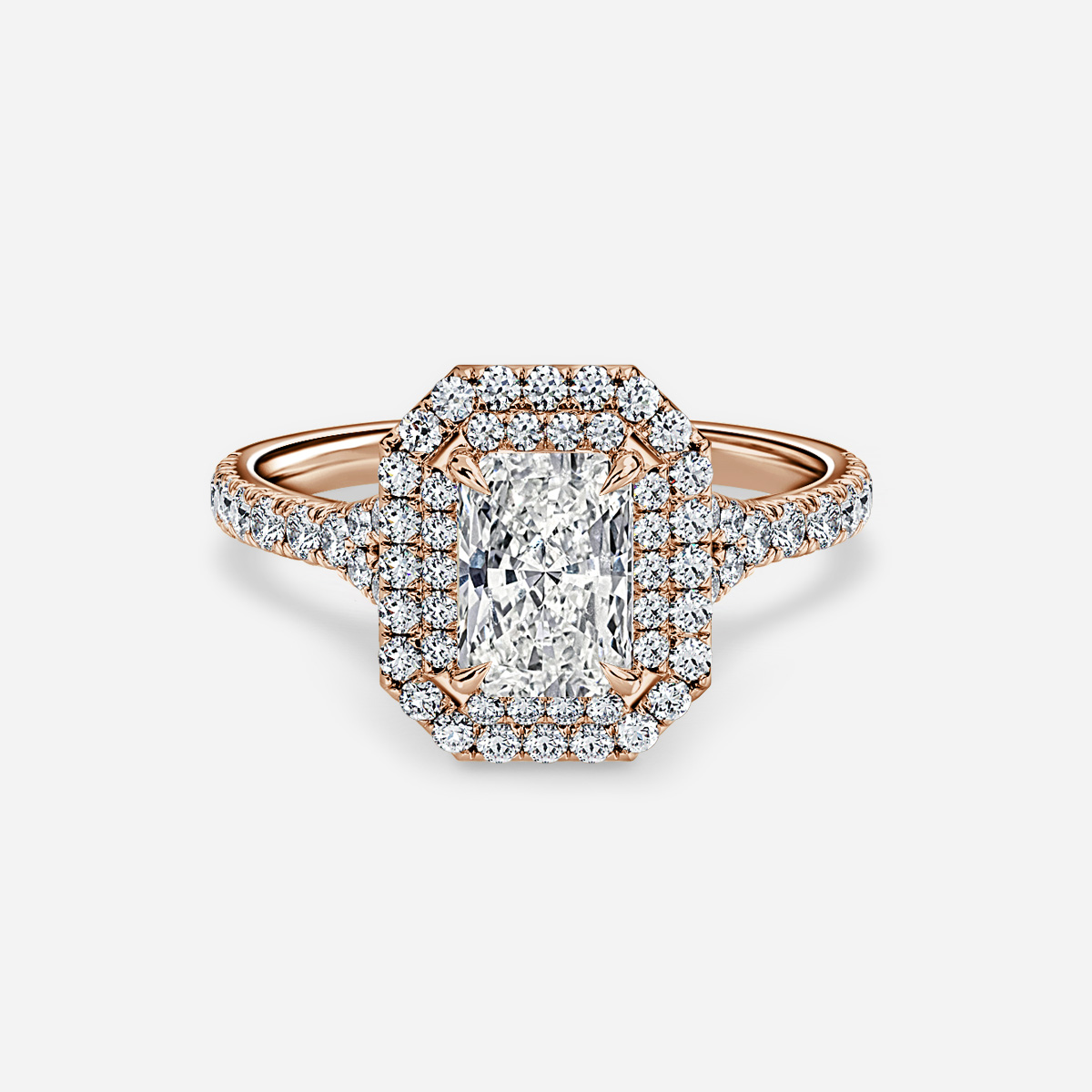 This rose gold diamond modern engagement ring with a double halo, features a centre diamond surrounded by a two halo’s of smaller round cut diamonds. The added sparkle of the shoulder diamonds enhances the overall glamour of the ring. Handcrafted by our master jewellers in Hatton Gardens, London. Centre Diamond Not Included Setting Only