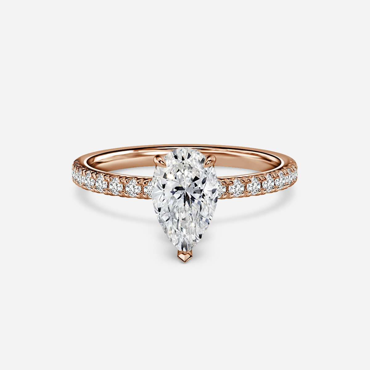 This petal micro pave diamond engagement ring features sophisticated glamour with a rose gold finish and four elegant claws that securely cradle the brilliant diamond in the center. Handcrafted in Hatton Gardens, London. Centre Diamond Not Included Setting Only