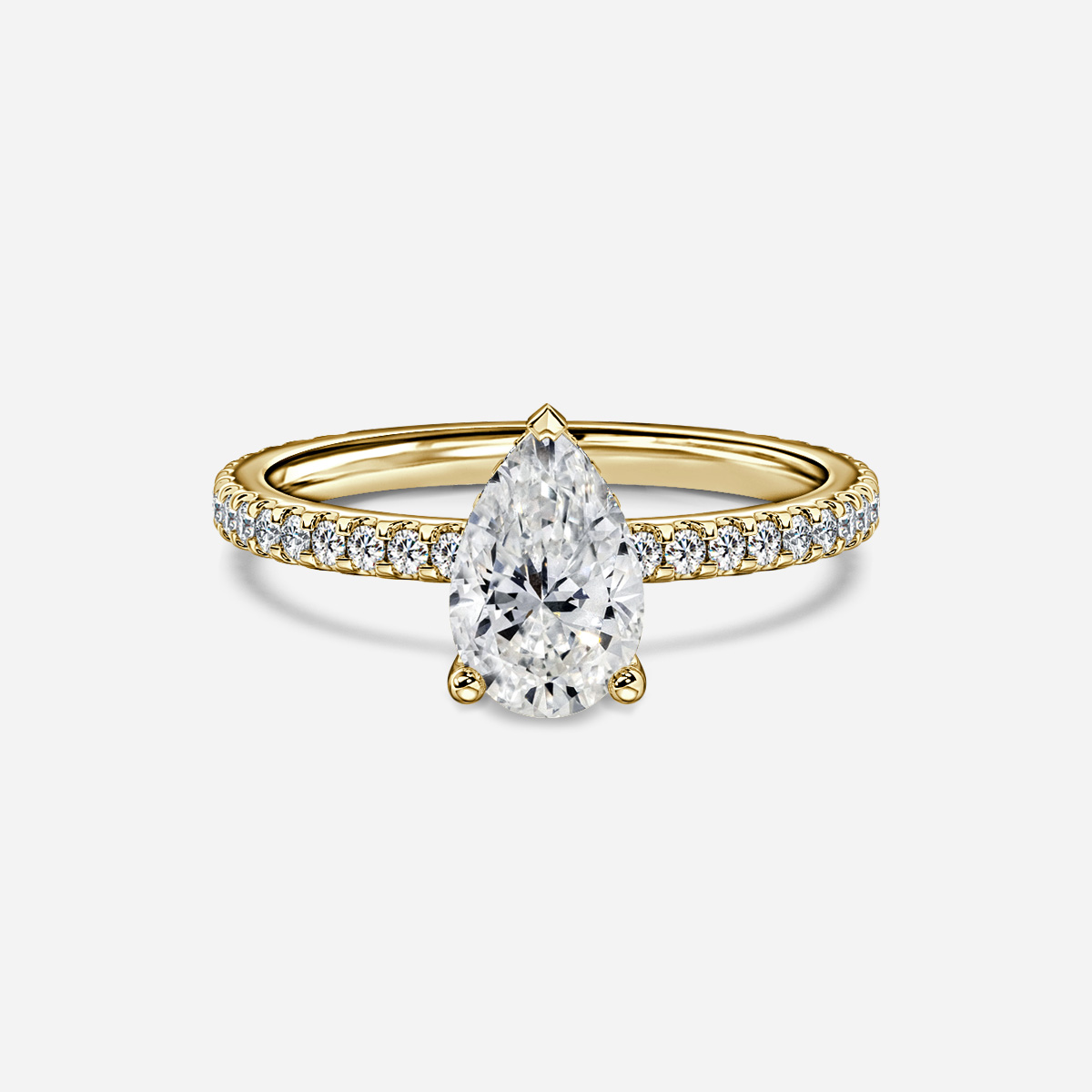 This hidden halo pave set yellow gold modern engagement ring captivates your attention by showcasing a beautiful diamond in the center. Round cut diamonds are arranged in french pave on the delicate shank of the ring. Handcrafted in Hatton Garden, London Center Diamond Not Included Setting Only