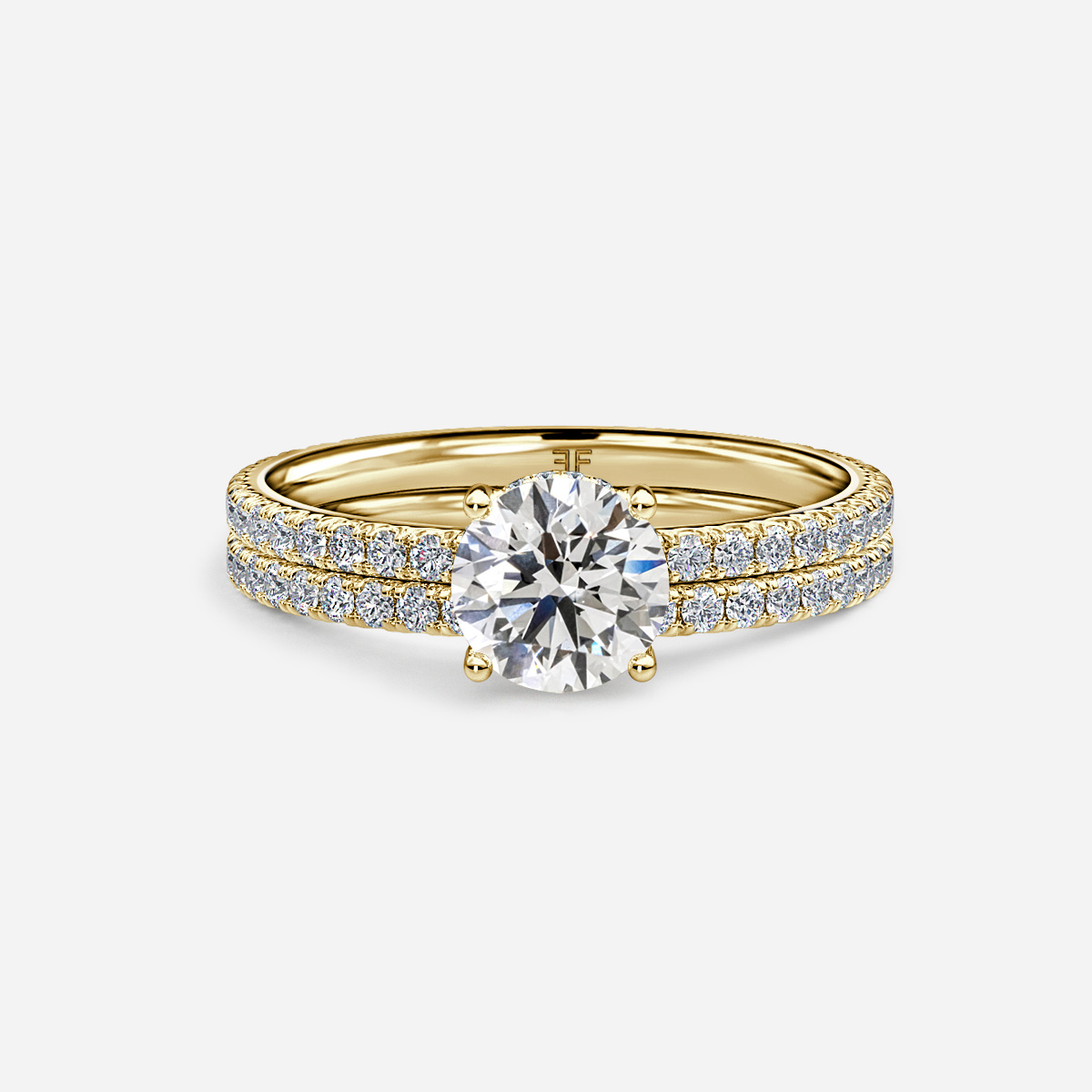 The Sadie Petite Yellow Gold Pavé Band Bridal Set Engagement Ring includes an elegant hidden halo engagement ring with a delicate pave band, along with a diamond band wedding ring, offering timeless sophistication. Handcrafted in Hatton Garden, London Center Diamond Not Included Setting Only