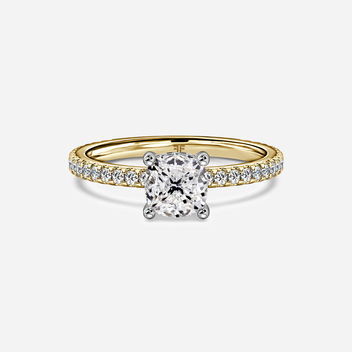 This hidden halo pave set yellow gold two tone engagement ring captivates your attention by showcasing a beautiful diamond in the center. Round cut diamonds are arranged in french pave on the delicate shank of the ring. Handcrafted in Hatton Garden, London Center Diamond Not Included Setting Only