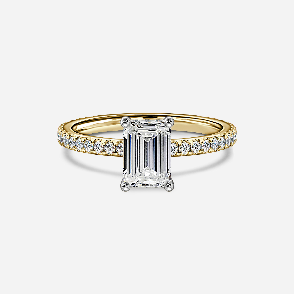 This hidden halo pave set yellow gold two tone engagement ring captivates your attention by showcasing a beautiful diamond in the center. Round cut diamonds are arranged in french pave on the delicate shank of the ring. Handcrafted in Hatton Garden, London Center Diamond Not Included Setting Only