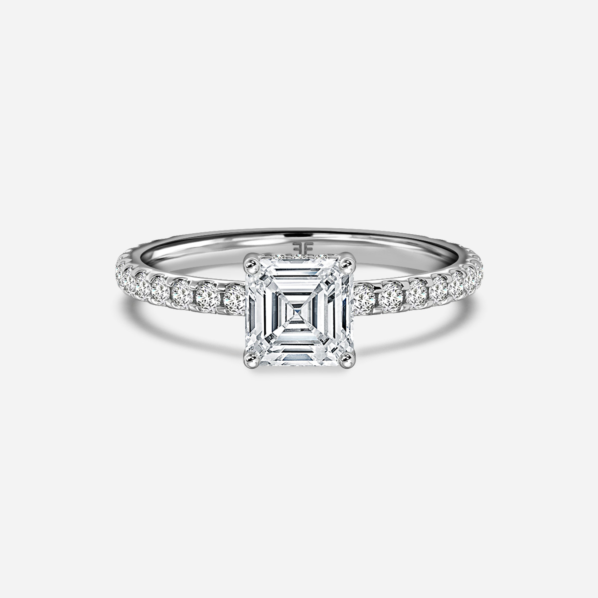 The Sadie is a culmination of refinement which strikes the perfect balance between the centre and accent stones. The finely scalloped shoulder setting and subtle halo allows maximum light to emphasise the life of the diamonds. Handcrafted in Hatton Garden, London. Centre Diamond Not Included, Setting Only.