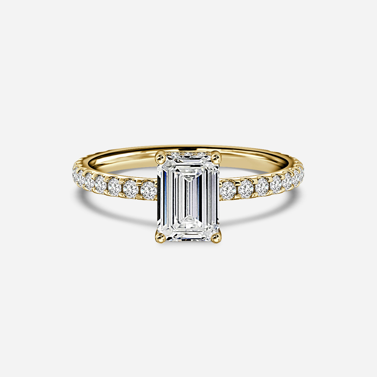The Sadie is a culmination of refinement which strikes the perfect balance between the center and accent stones. The finely scalloped shoulder setting and subtle halo allows maximum light to emphasize the life of the diamonds. Handcrafted in Hatton Garden, London. Diamond Center Not Included, Setting Only.