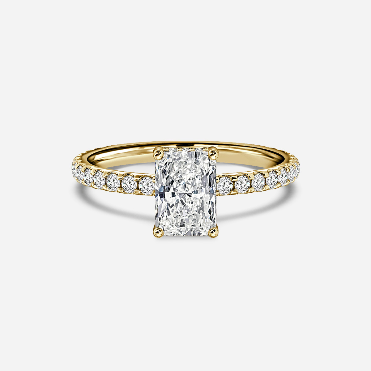 The Sadie is a culmination of refinement which strikes the perfect balance between the center and accent stones. The finely scalloped shoulder setting and subtle halo allows maximum light to emphasize the life of the diamonds. Handcrafted in Hatton Garden, London. Diamond Center Not Included, Setting Only.