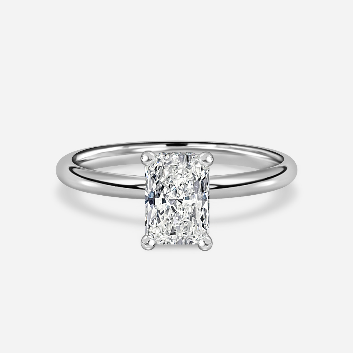 The Samara Plain Band White Gold Hidden Halo Engagement Ring is a stunning symbol of love, featuring a hidden halo of smaller diamonds delicately wrapped around the prongs, creating a captivating and elegant design. Handcrafted in Hatton Gardens, London. Setting Only