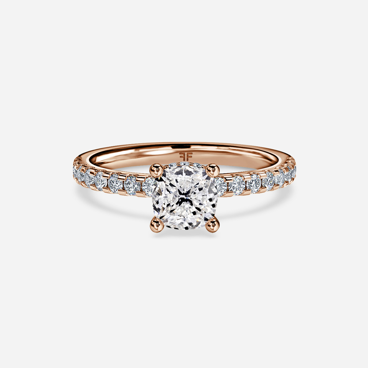 A rose gold hidden halo engagement ring featuring smaller diamonds wrapped around the prongs, beautifully combining modern style with timeless elegance. Handcrafted in Hatton Garden, London Center Diamond Not Included Setting Only