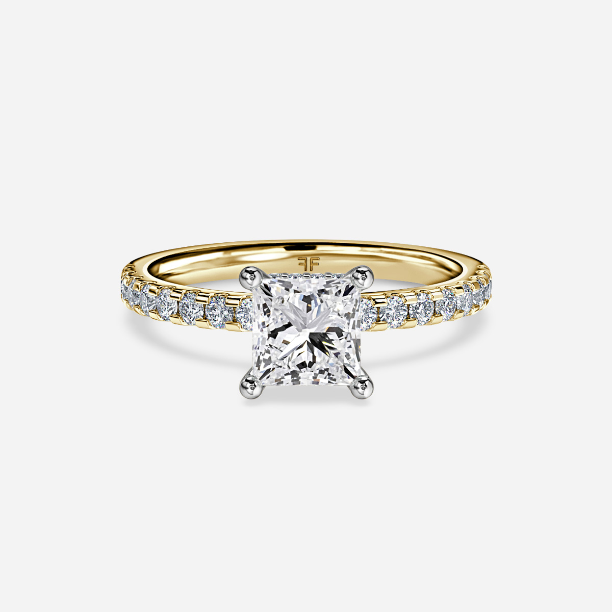 A yellow gold two tone hidden halo engagement ring featuring smaller diamonds wrapped around the prongs, beautifully combining modern style with timeless elegance. Handcrafted in Hatton Garden, London Center Diamond Not Included Setting Only
