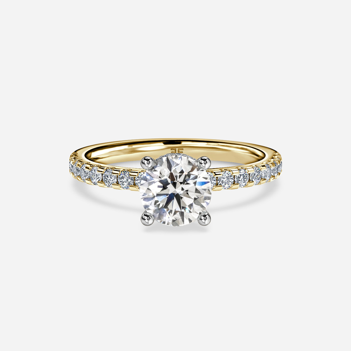 A yellow gold two tone hidden halo engagement ring featuring smaller diamonds wrapped around the prongs, beautifully combining modern style with timeless elegance. Handcrafted in Hatton Garden, London Center Diamond Not Included Setting Only
