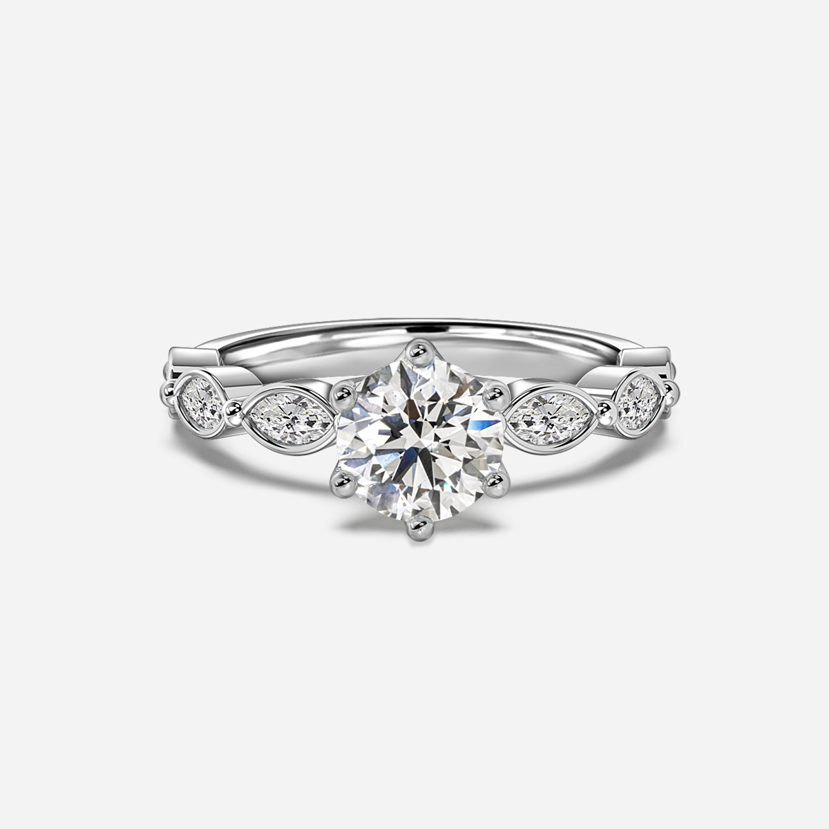 The Sarah Platinum Bezel Engagement Ring features a brilliant center diamond securely held by six prongs, complemented by marquise-shaped diamonds in a sleek bezel setting along the band. This design blends timeless elegance with modern style, creating a stunning symbol of love. Handcrafted in Hatton Gardens, London. Centre Diamond Not Included Setting Only