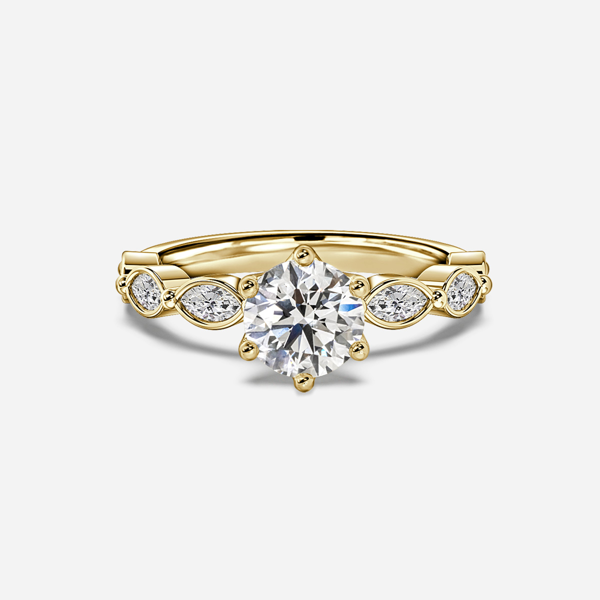 The Sarah Yellow Gold Bezel Engagement Ring features a brilliant center diamond securely held by six prongs, complemented by marquise-shaped diamonds in a sleek bezel setting along the band. This design blends timeless elegance with modern style, creating a stunning symbol of love. Handcrafted in Hatton Gardens, London. Centre Diamond Not Included Setting Only