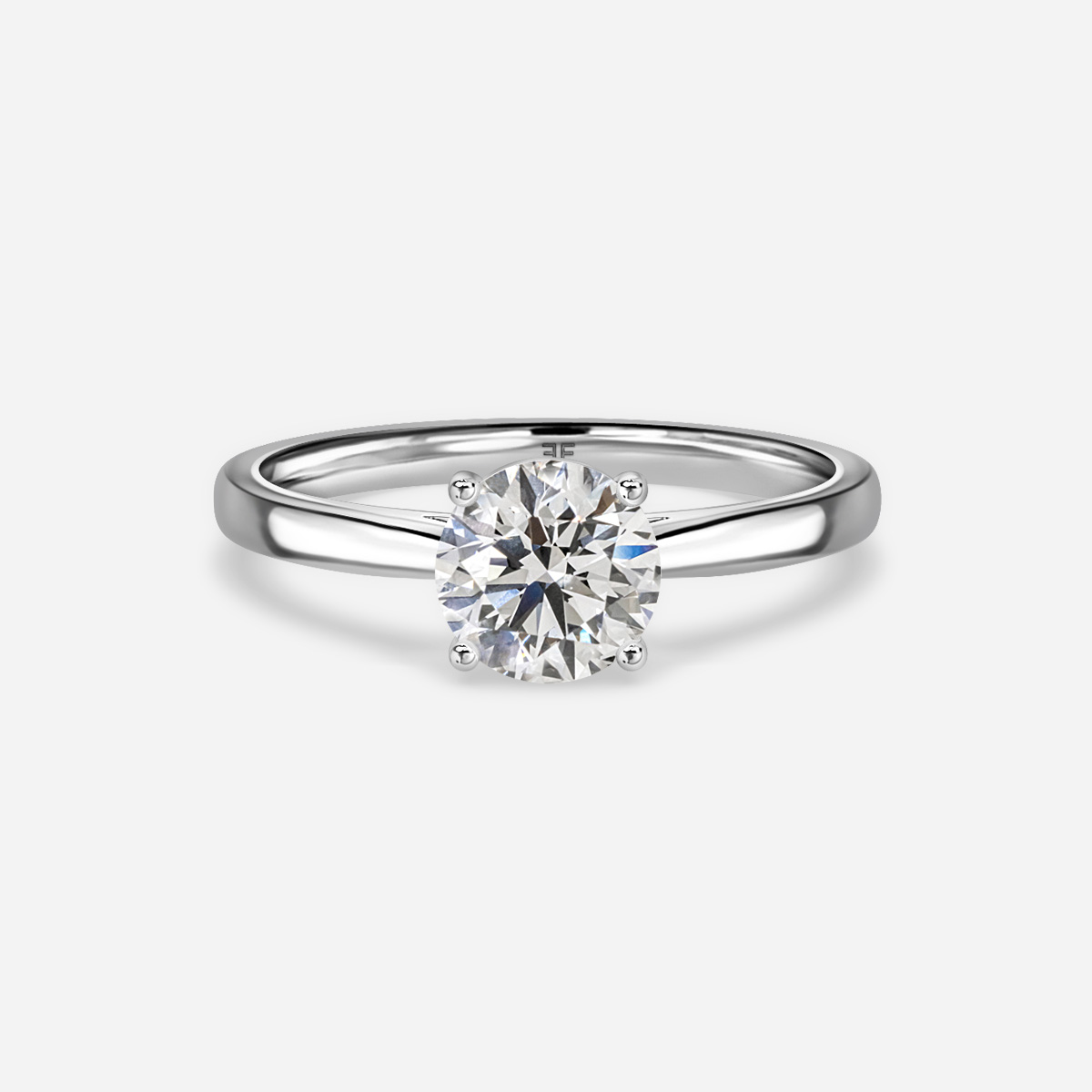 A white gold solitaire engagement ring featuring a plain band and four delicate claw prongs which hold the centre stone in the utmost distinguished fashion. Handcrafted in Hatton Gardens, Centre Diamond Not Included Setting only