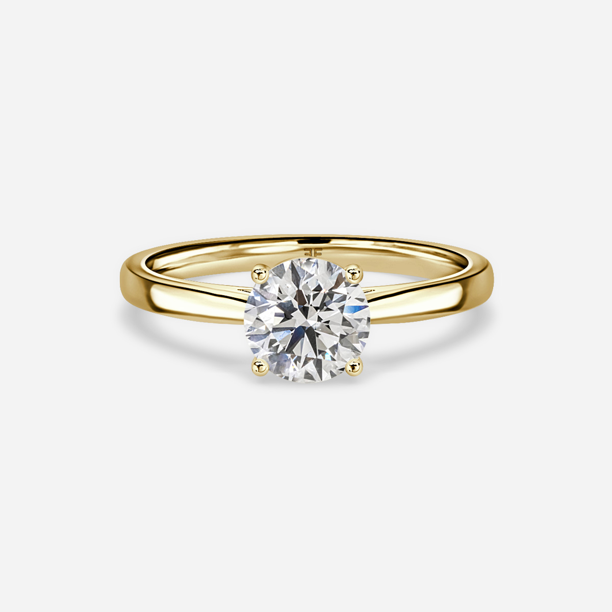 A yellow gold solitaire engagement ring featuring a plain band and four delicate claw prongs which hold the centre stone in the utmost distinguished fashion. Handcrafted in Hatton Gardens, Centre Diamond Not Included Setting only