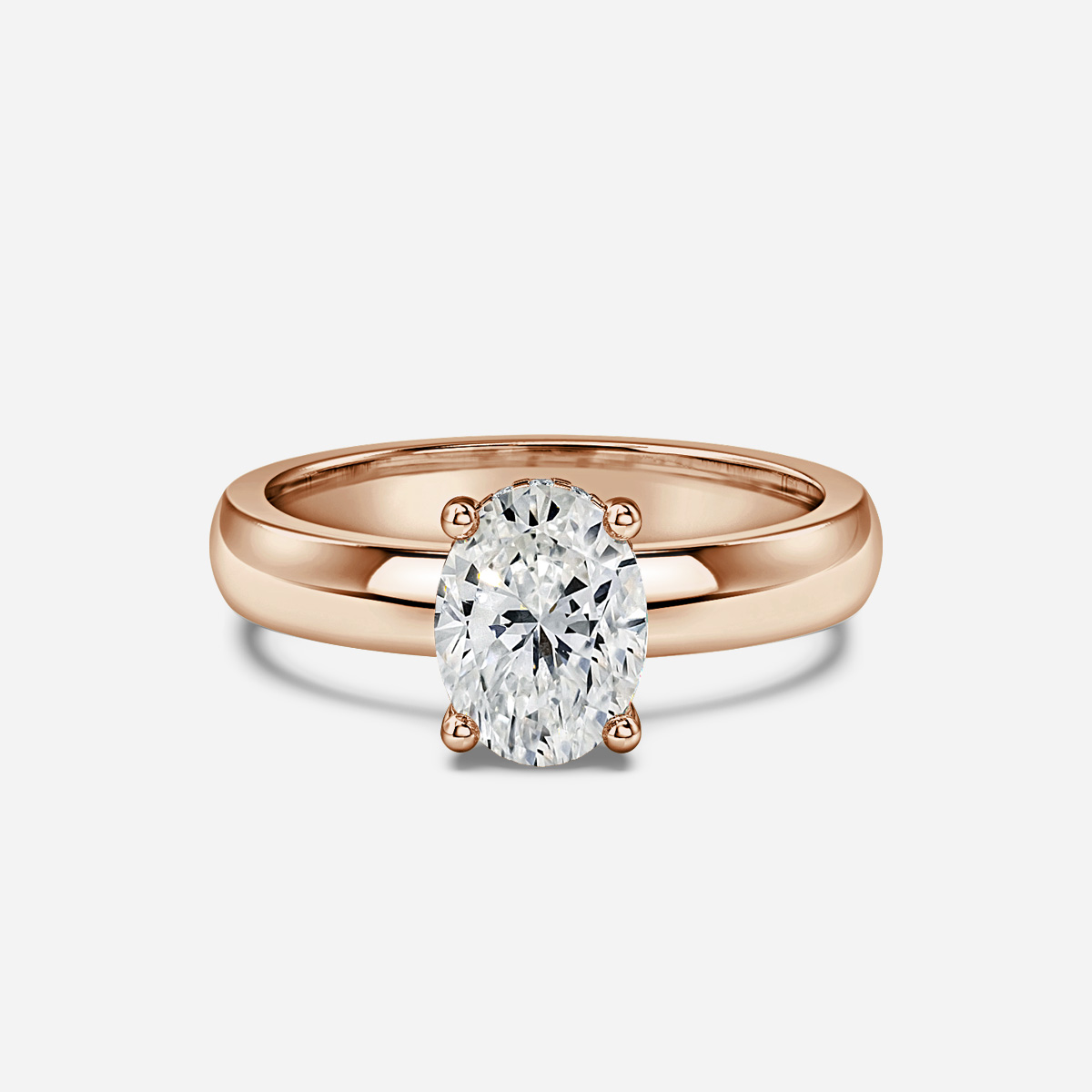 The Sky engagement ring is designed with a single diamond held in a four-prong setting, crafted in 18K rose gold. A hidden halo sits just below the centre stone, adding a soft sparkle that catches the light beautifully. Its thick polished band gives the ring a clean and modern look, making it perfect for someone who loves simple elegance with a touch of detail. Handcrafted by Flawless Fine Jewellery, Hatton Garden, London. Centre Diamond Not Included Setting only