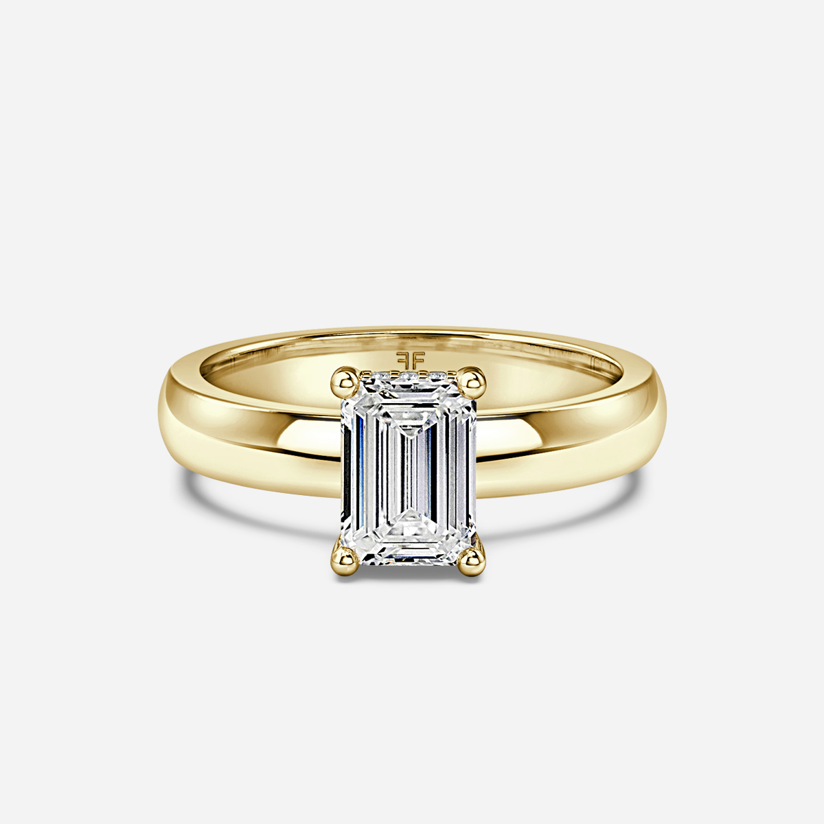 The Sky engagement ring is designed with a single diamond held in a four-prong setting, crafted in 18K yellow gold. A hidden halo sits just below the centre stone, adding a soft sparkle that catches the light beautifully. Its thick polished band gives the ring a clean and modern look, making it perfect for someone who loves simple elegance with a touch of detail. Handcrafted by Flawless Fine Jewellery, Hatton Garden, London. Centre Diamond Not Included Setting only