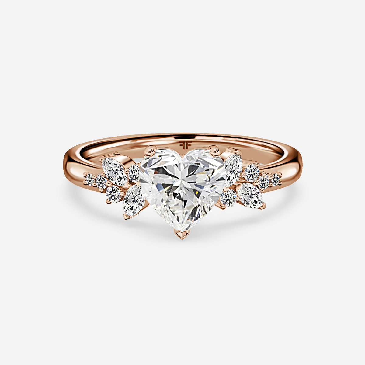 The flower pattern engagement ring in rose gold features a stunning round and marquise diamond on each side of the center stone. The arrangement creates a beautiful and intricate design that is both timeless and elegant. This engagement ring is the perfect symbol of love and commitment to last a lifetime. Handcrafted in Hatton Garden, London Centre Diamond Not Included Setting Only