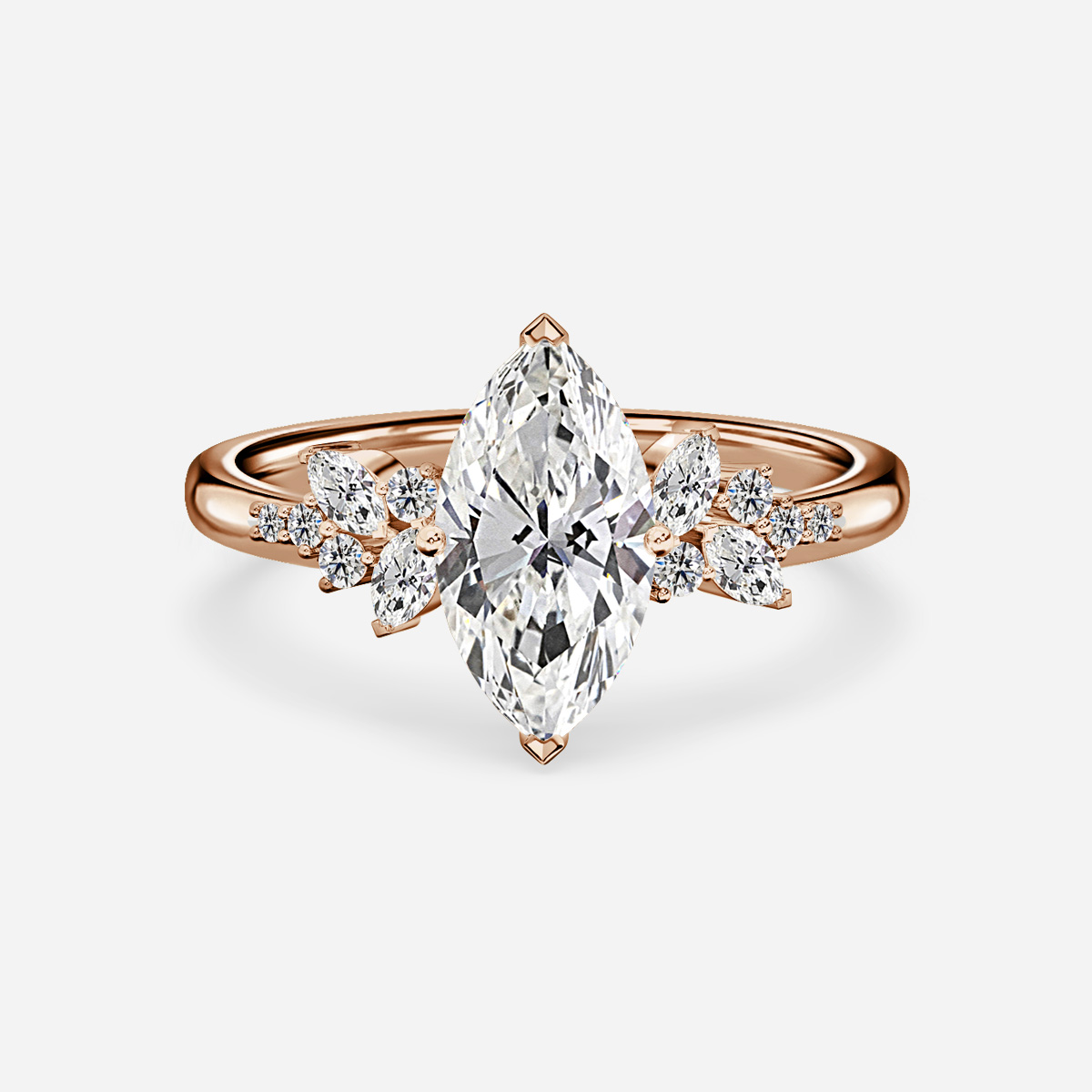 The flower pattern engagement ring in rose gold features a stunning round and marquise diamond on each side of the center stone. The arrangement creates a beautiful and intricate design that is both timeless and elegant. This engagement ring is the perfect symbol of love and commitment to last a lifetime. Handcrafted in Hatton Garden, London Centre Diamond Not Included Setting Only
