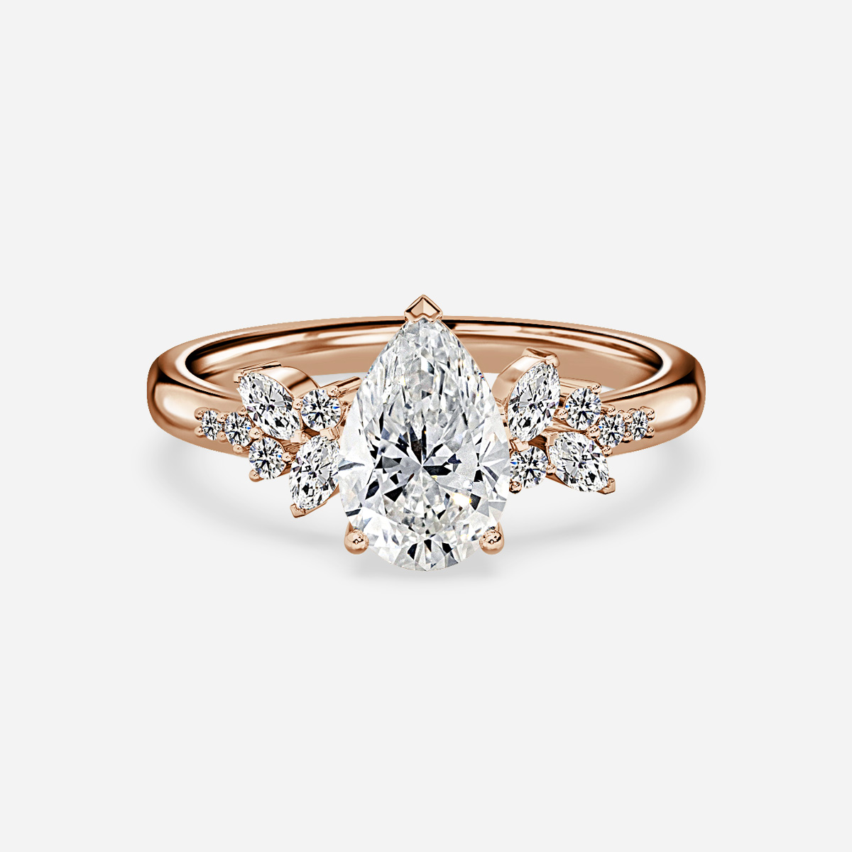The flower pattern engagement ring in rose gold features a stunning round and marquise diamond on each side of the center stone. The arrangement creates a beautiful and intricate design that is both timeless and elegant. This engagement ring is the perfect symbol of love and commitment to last a lifetime. Handcrafted in Hatton Garden, London Centre Diamond Not Included Setting Only