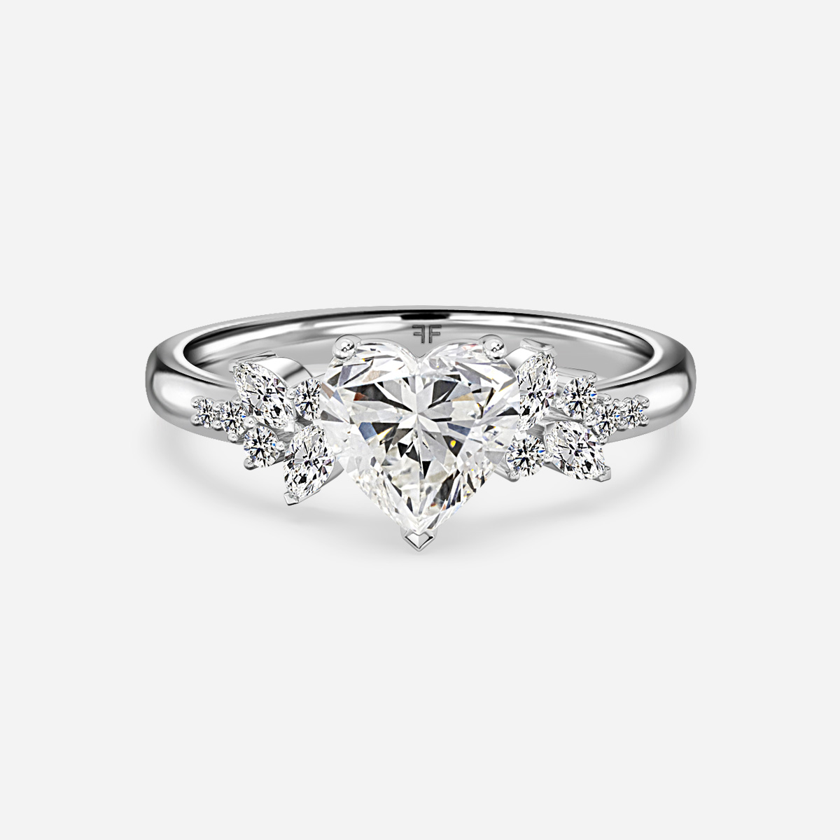 The flower pattern engagement ring in white gold features a stunning round and marquise diamond on each side of the center stone. The arrangement creates a beautiful and intricate design that is both timeless and elegant. This engagement ring is the perfect symbol of love and commitment to last a lifetime. Handcrafted in Hatton Garden, London Centre Diamond Not Included Setting Only