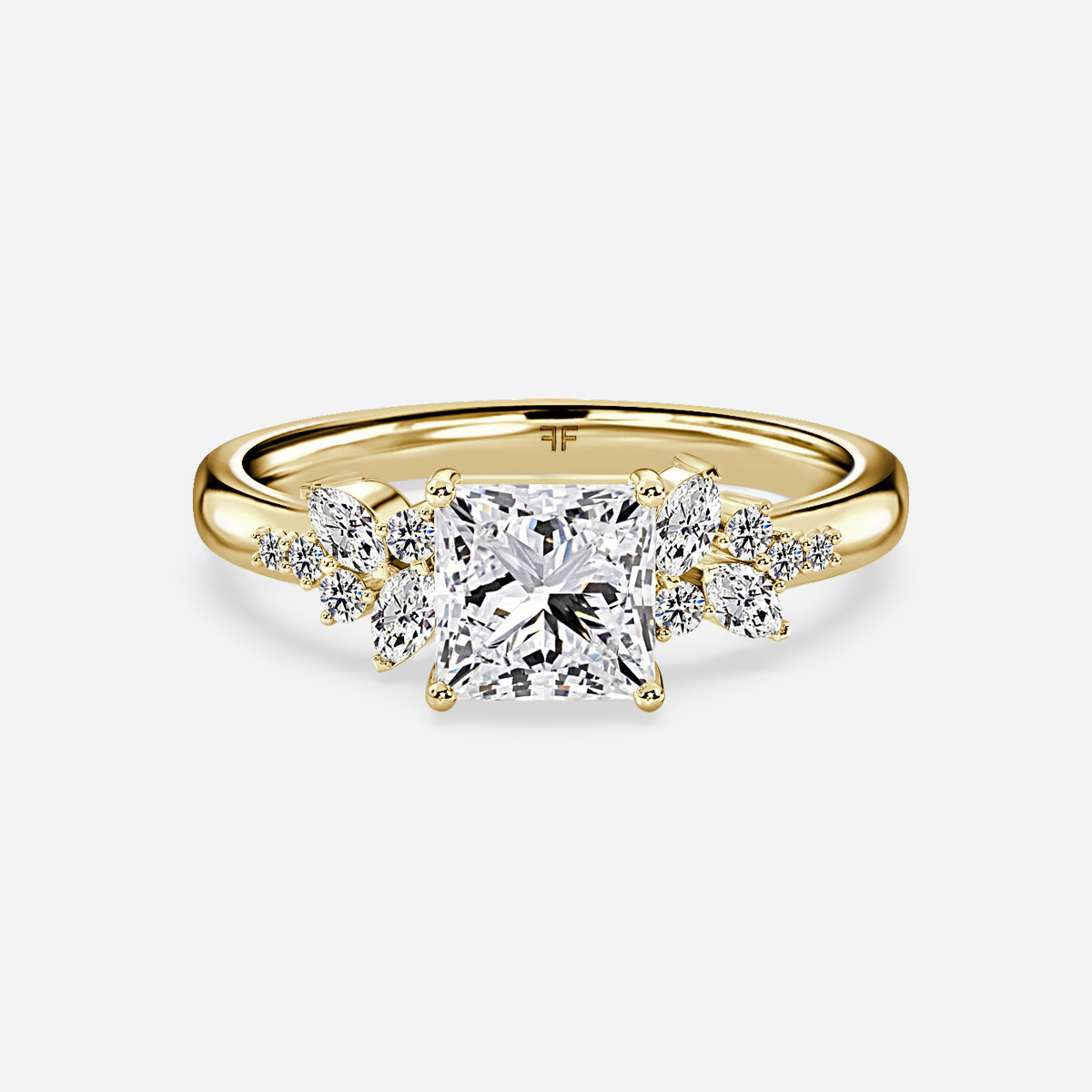The flower pattern engagement ring in yellow gold features a stunning round and marquise diamond on each side of the center stone. The arrangement creates a beautiful and intricate design that is both timeless and elegant. This engagement ring is the perfect symbol of love and commitment to last a lifetime. Handcrafted in Hatton Garden, London Centre Diamond Not Included Setting Only