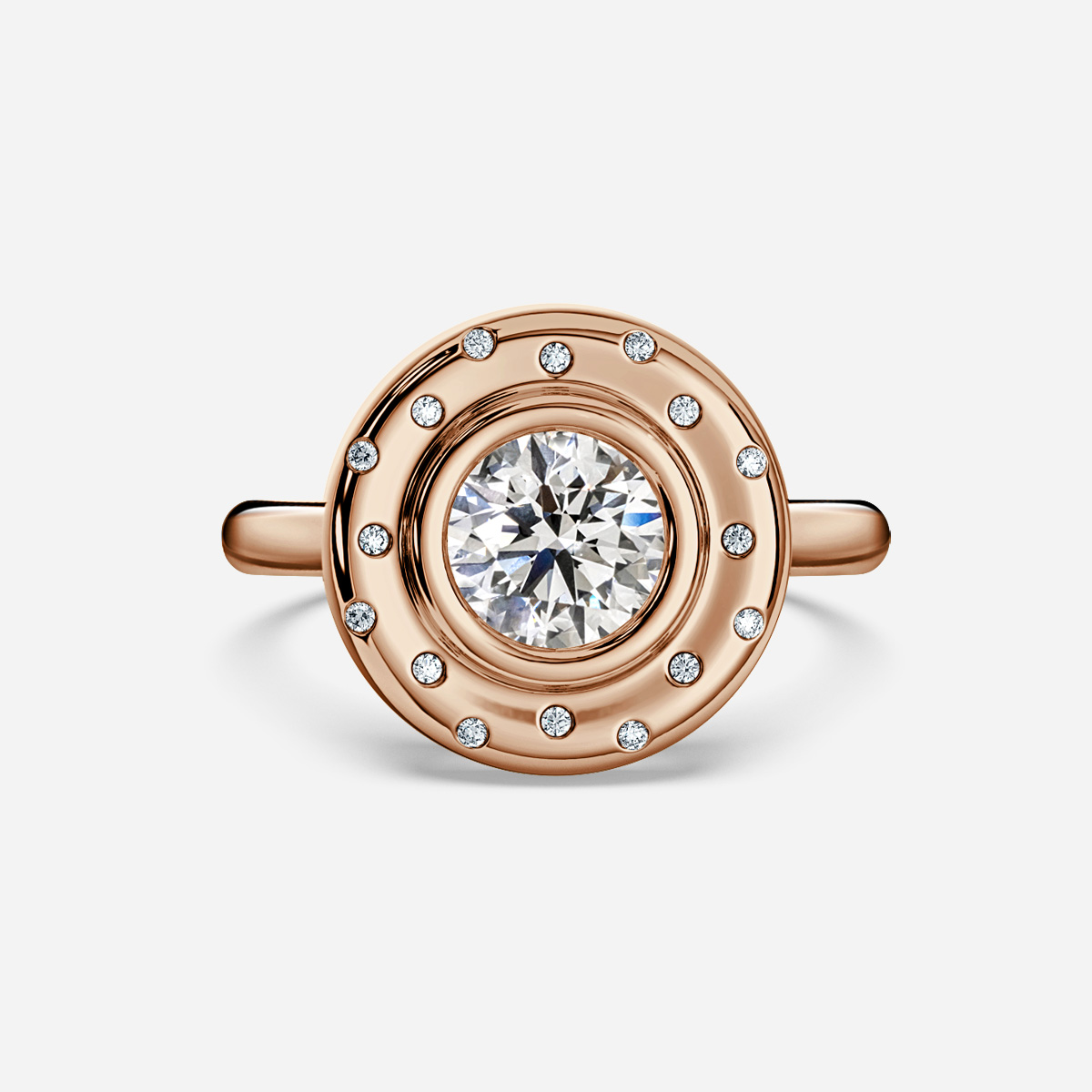 The Starry Ring in rose gold is a one-of-a-kind creation, blending timeless artistry with celestial inspiration. Its central round-cut diamond is bezel-set and framed by a warm rose gold halo, scattered with twinkling accents that evoke a romantic night sky — an exceptional piece for those who love a hint of magic and individuality. Handcrafted in Hatton Gardens, London. Centre Diamond Not Included. Setting Only