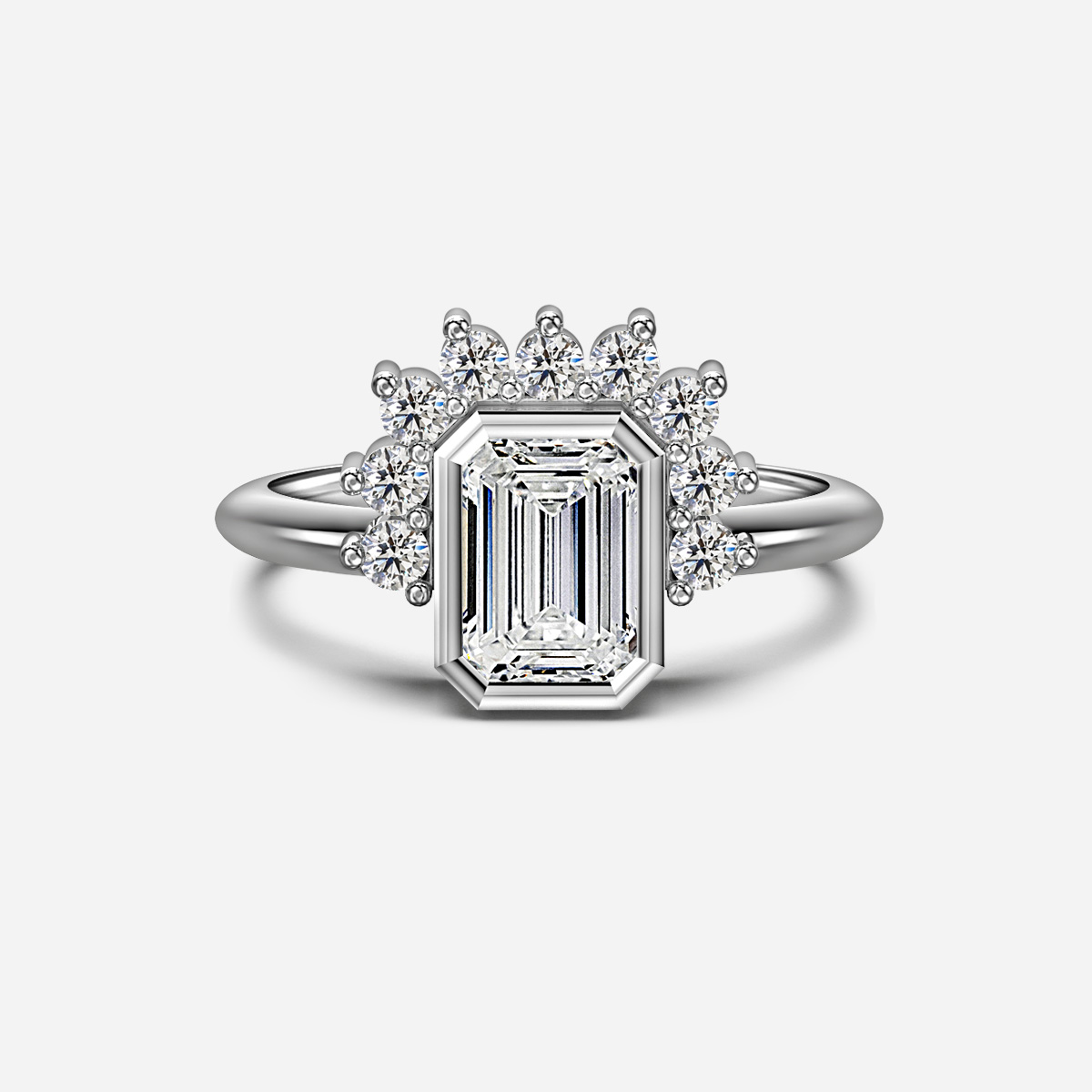 The Sunset Platinum Cluster Engagement Ring features a fiery center stone half-surrounded by a halo of dazzling pavé diamonds. Set in enduring platinum, it exudes a perfect blend of modern elegance and radiant allure. Handcrafted in Hatton Garden, London. Centre Diamond Not Included, Setting Only.
