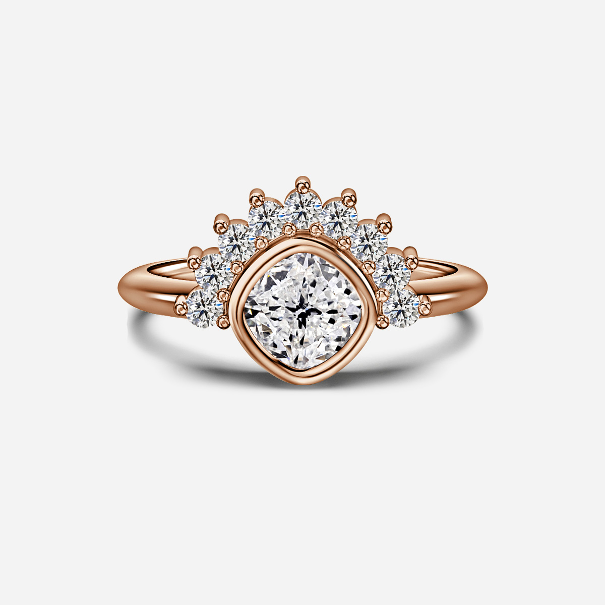 The Sunset Rose Gold Cluster Engagement Ring features a fiery center stone half-surrounded by a halo of dazzling pavé diamonds. Set in enduring rose gold, it exudes a perfect blend of modern elegance and radiant allure. Handcrafted in Hatton Garden, London. Centre Diamond Not Included, Setting Only.