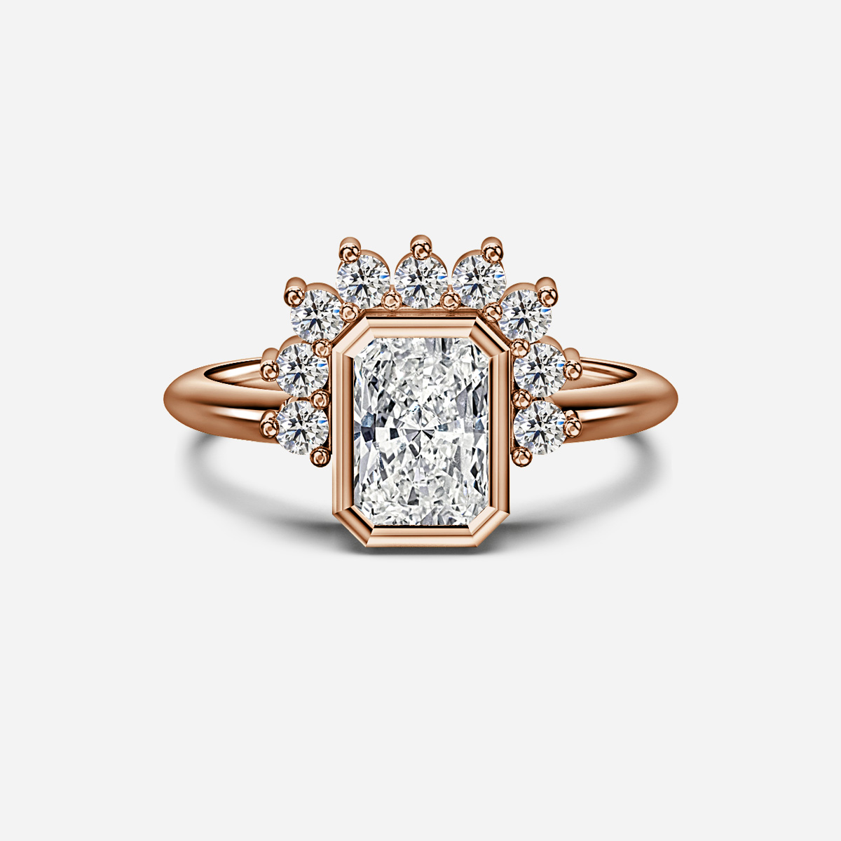 The Sunset Rose Gold Cluster Engagement Ring features a fiery center stone half-surrounded by a halo of dazzling pavé diamonds. Set in enduring rose gold, it exudes a perfect blend of modern elegance and radiant allure. Handcrafted in Hatton Garden, London. Centre Diamond Not Included, Setting Only.