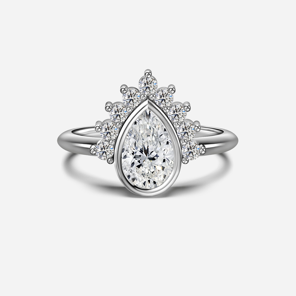 The Sunset White Gold Cluster Engagement Ring features a fiery center stone half-surrounded by a halo of dazzling pavé diamonds. Set in enduring white gold, it exudes a perfect blend of modern elegance and radiant allure. Handcrafted in Hatton Garden, London. Centre Diamond Not Included, Setting Only.