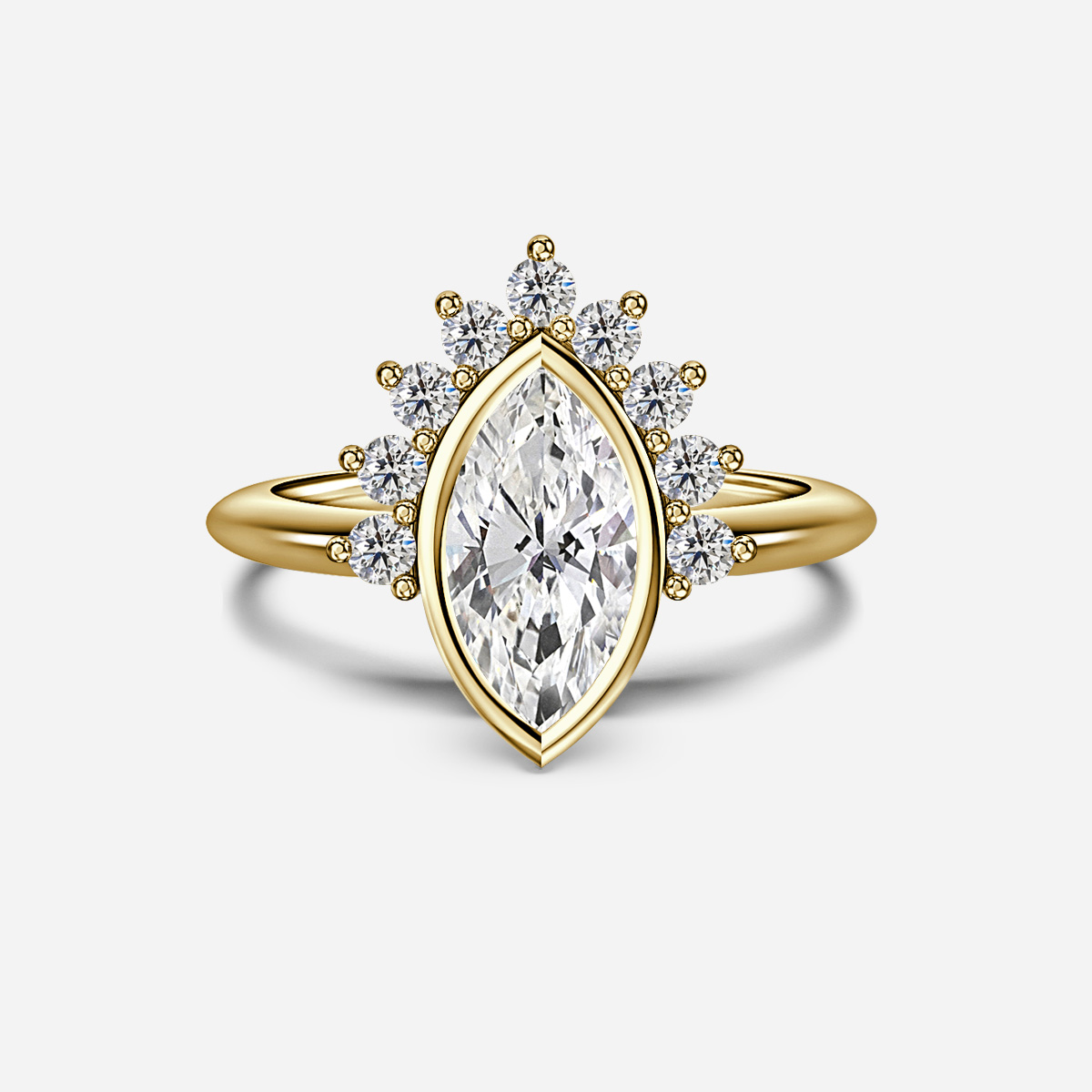 The Sunset Yellow Gold Cluster Engagement Ring features a fiery center stone half-surrounded by a halo of dazzling pavé diamonds. Set in enduring yellow gold, it exudes a perfect blend of modern elegance and radiant allure. Handcrafted in Hatton Garden, London. Centre Diamond Not Included, Setting Only.