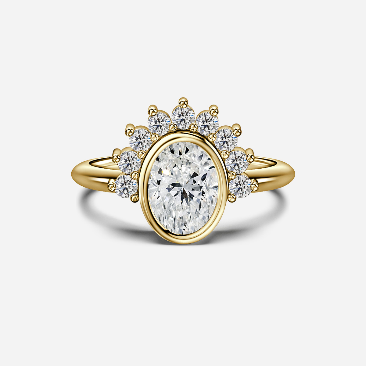 The Sunset Yellow Gold Cluster Engagement Ring features a fiery center stone half-surrounded by a halo of dazzling pavé diamonds. Set in enduring yellow gold, it exudes a perfect blend of modern elegance and radiant allure. Handcrafted in Hatton Garden, London. Centre Diamond Not Included, Setting Only.