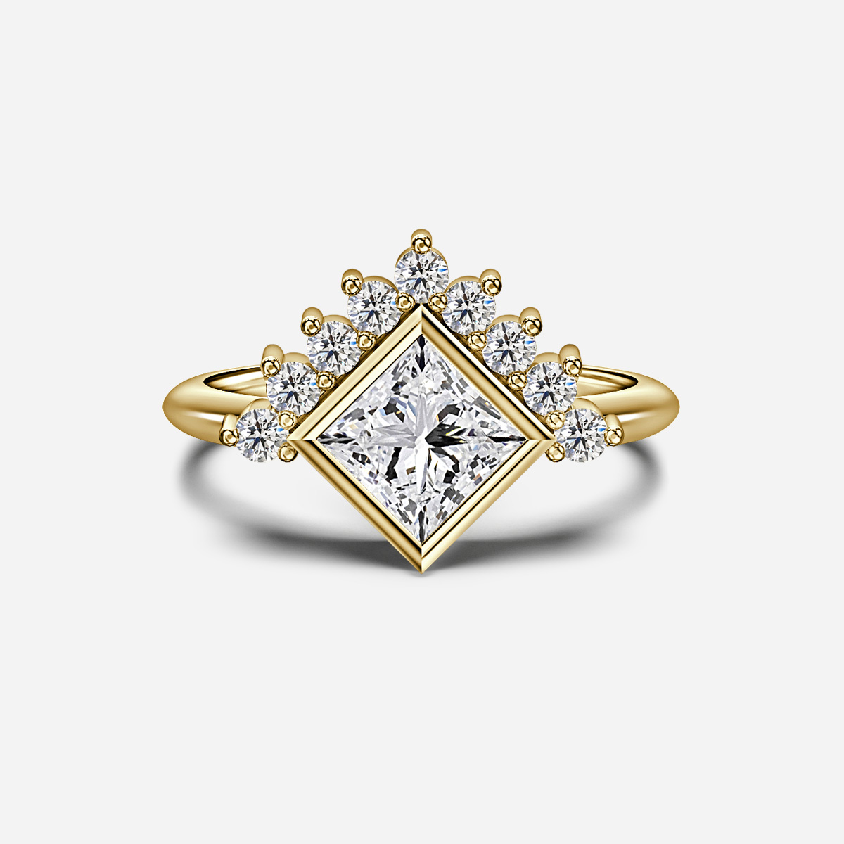 The Sunset Yellow Gold Cluster Engagement Ring features a fiery center stone half-surrounded by a halo of dazzling pavé diamonds. Set in enduring yellow gold, it exudes a perfect blend of modern elegance and radiant allure. Handcrafted in Hatton Garden, London. Centre Diamond Not Included, Setting Only.