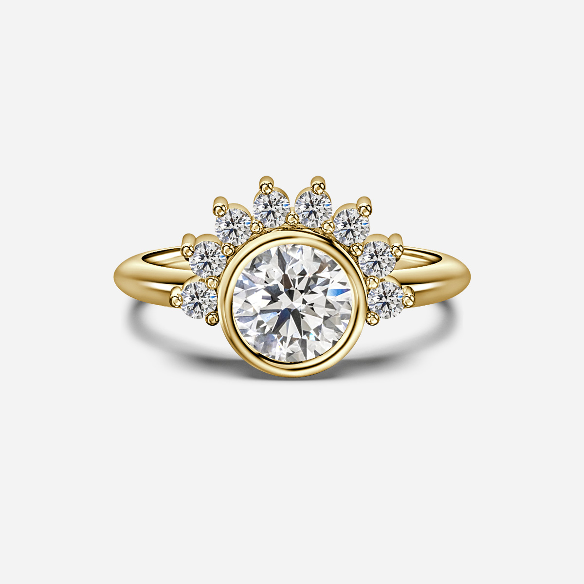 The Sunset Yellow Gold Cluster Engagement Ring features a fiery center stone half-surrounded by a halo of dazzling pavé diamonds. Set in enduring yellow gold, it exudes a perfect blend of modern elegance and radiant allure. Handcrafted in Hatton Garden, London. Centre Diamond Not Included, Setting Only.