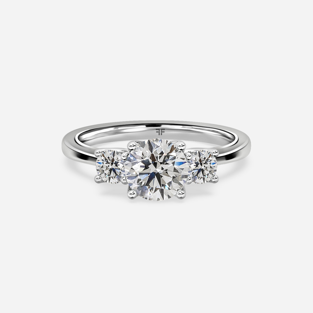 A platinum trilogy engagement ring features three round stones set in a delicate band. It has two stones on either side of the center diamond, creating an elegant and timeless look. Handcrafted in Hatton Gardens, London. Centre Diamond Not Included Setting only