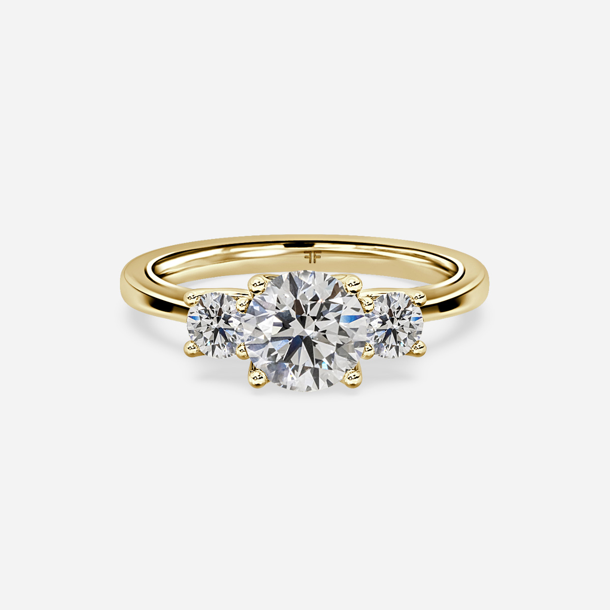 A yellow gold trilogy engagement ring features three round stones set in a delicate band. It has two stones on either side of the center diamond, creating an elegant and timeless look. Handcrafted in Hatton Gardens, London. Centre Diamond Not Included Setting only