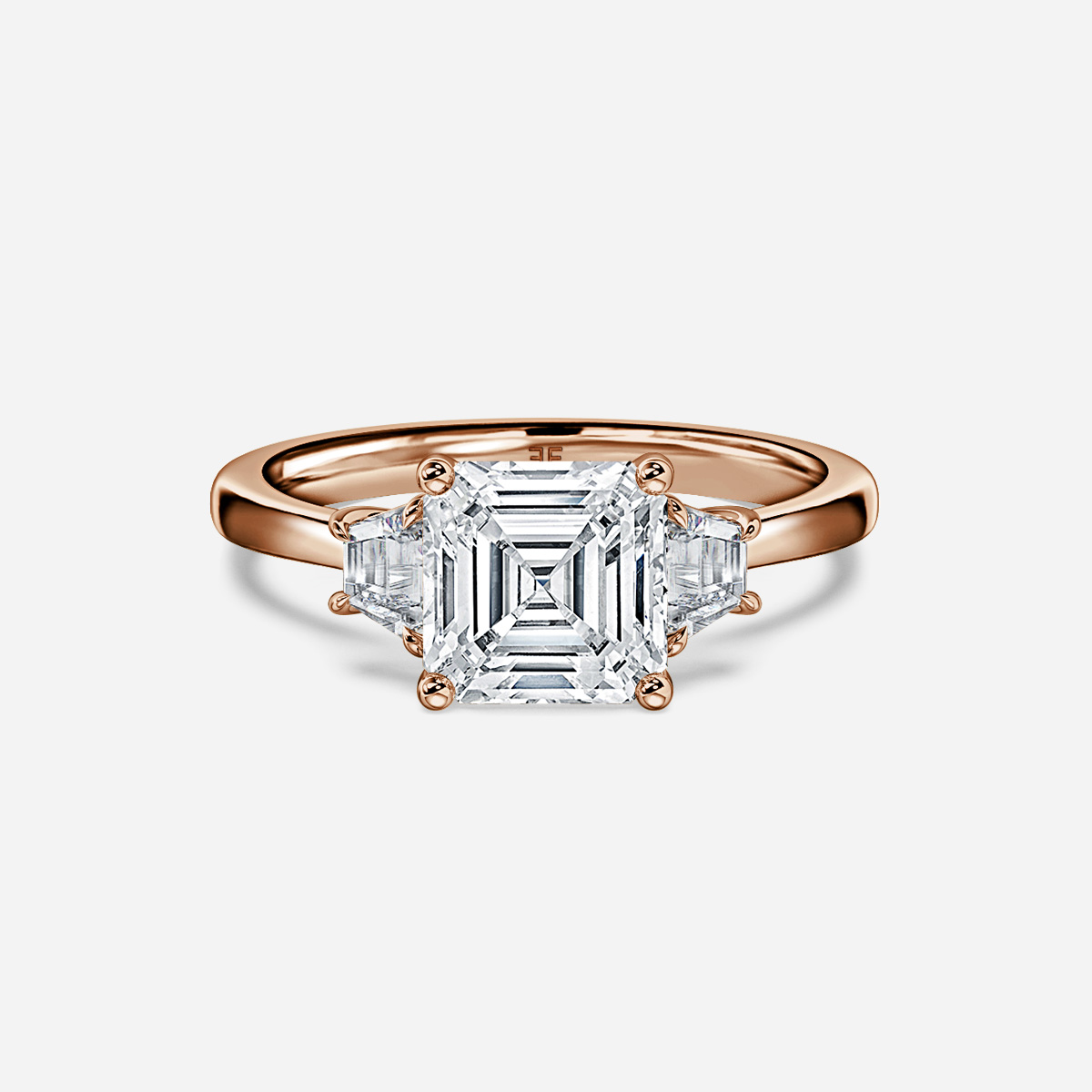 The trapezoid diamonds flanking the center diamond are very unique, their tapered shape gently guiding the eye to brilliant stone. The Treya is a testament to the enduring majesty of the trilogy style. Handcrafted in Hatton Garden, London. Centre Diamond Not Included, Setting only.