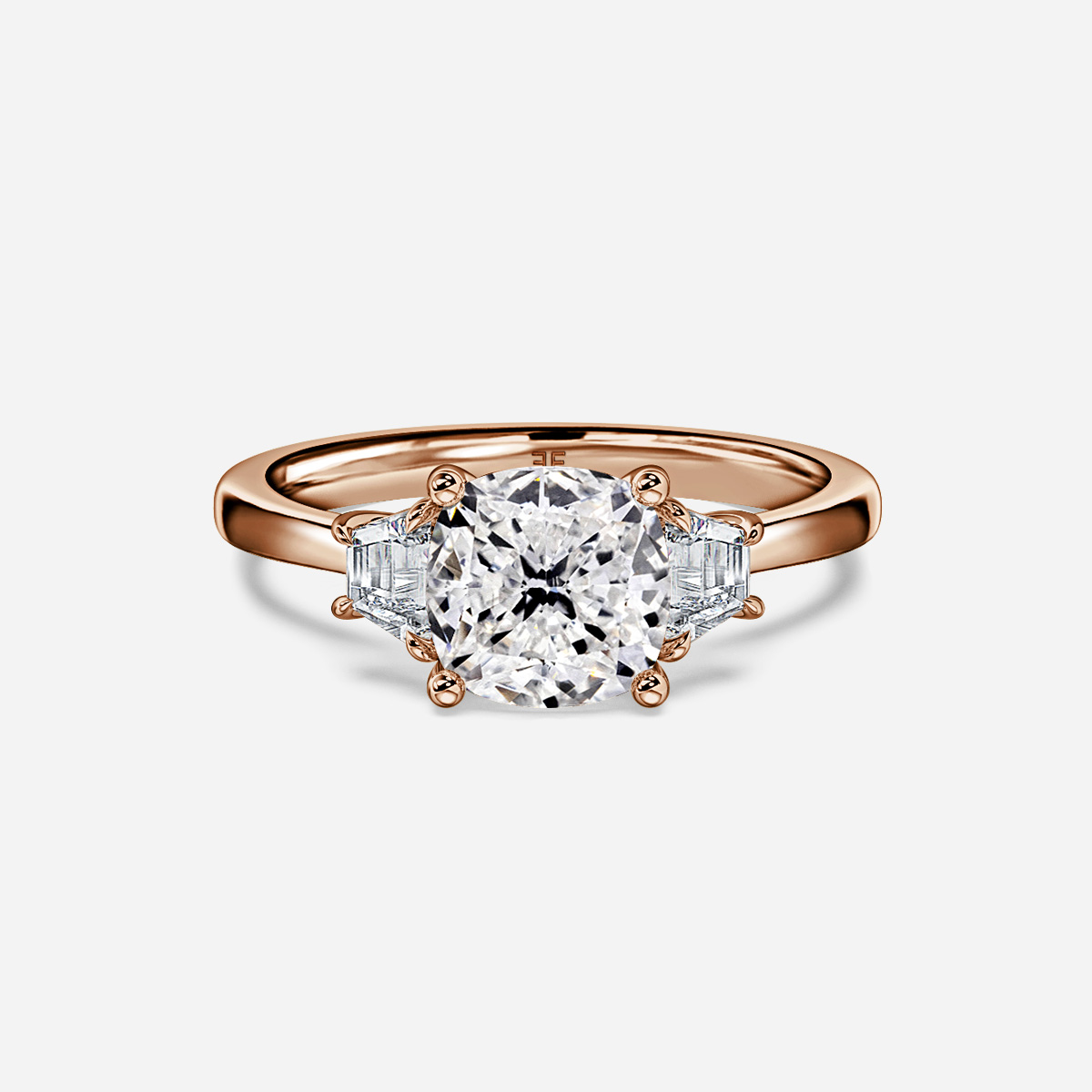 The trapezoid diamonds flanking the center diamond are very unique, their tapered shape gently guiding the eye to brilliant stone. The Treya is a testament to the enduring majesty of the trilogy style. Handcrafted in Hatton Garden, London. Centre Diamond Not Included, Setting only.