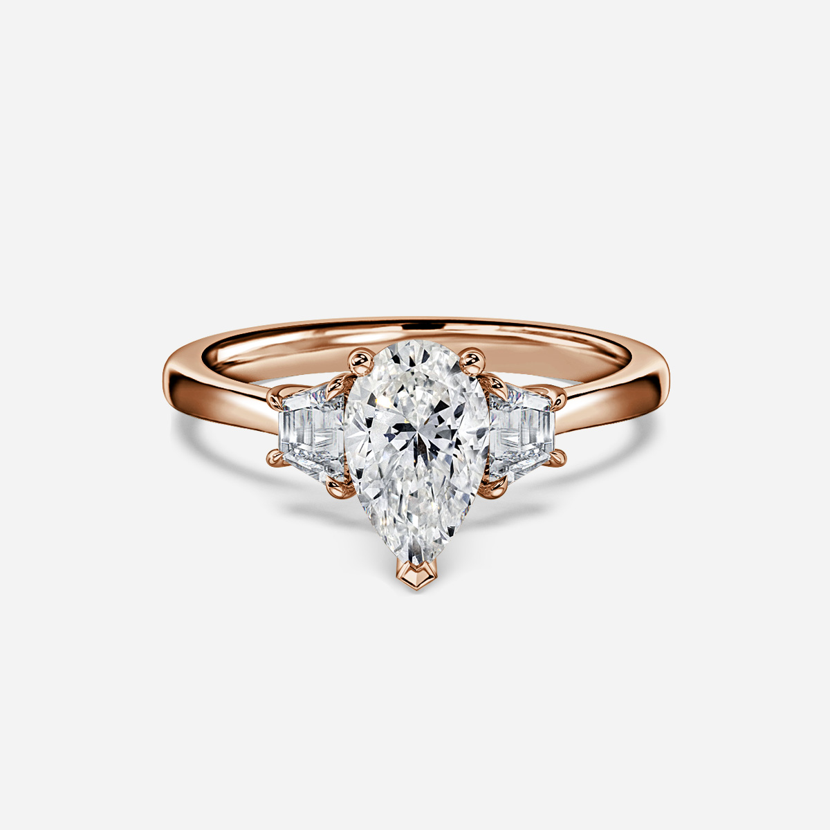 The trapezoid diamonds flanking the center diamond are very unique, their tapered shape gently guiding the eye to brilliant stone. The Treya is a testament to the enduring majesty of the trilogy style. Handcrafted in Hatton Garden, London. Centre Diamond Not Included, Setting only.