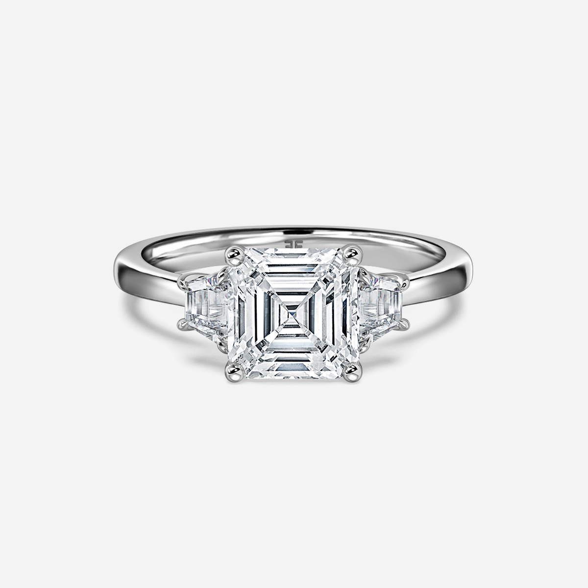 The trapezoid diamonds flanking the center diamond are very unique, their tapered shape gently guiding the eye to brilliant stone. The Treya is a testament to the enduring majesty of the trilogy style. Handcrafted in Hatton Garden, London. Diamond Center Not Included, Setting only.