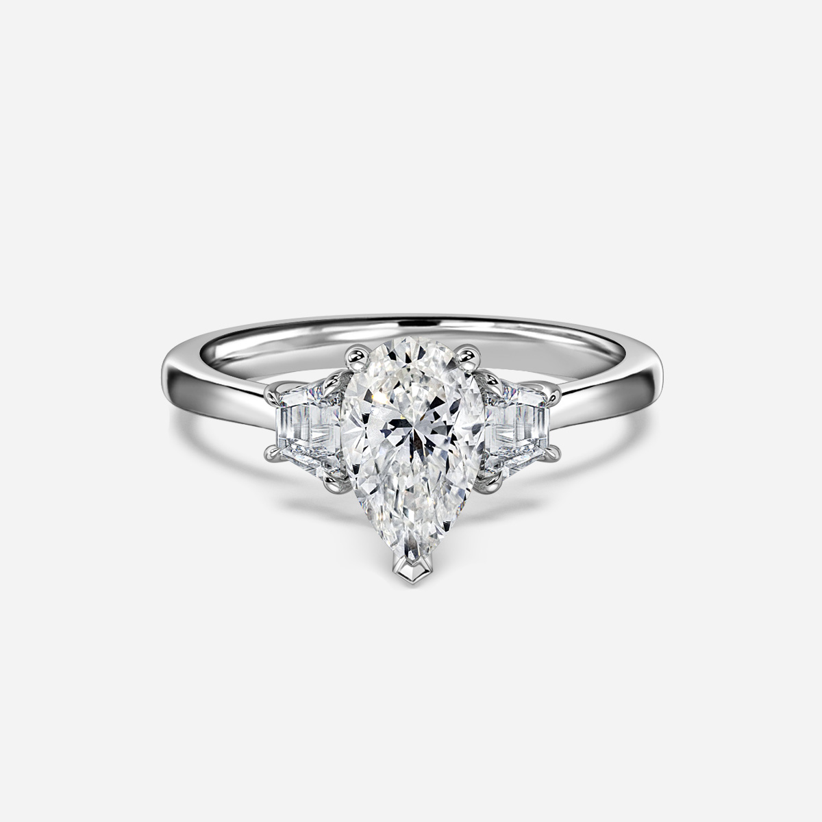 The trapezoid diamonds flanking the center diamond are very unique, their tapered shape gently guiding the eye to brilliant stone. The Treya is a testament to the enduring majesty of the trilogy style. Handcrafted in Hatton Garden, London. Diamond Center Not Included, Setting only.
