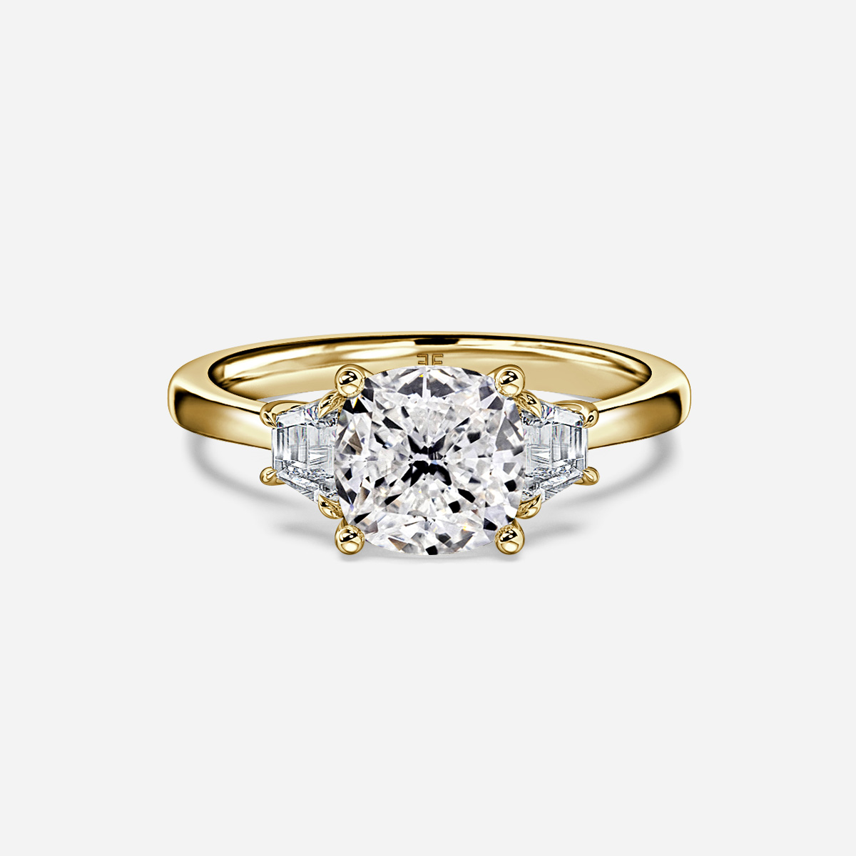 The trapezoid diamonds flanking the center diamond are very unique, their tapered shape gently guiding the eye to brilliant stone. The Treya is a testament to the enduring majesty of the trilogy style. Handcrafted in Hatton Garden, London. Centre Diamond Not Included, Setting only.