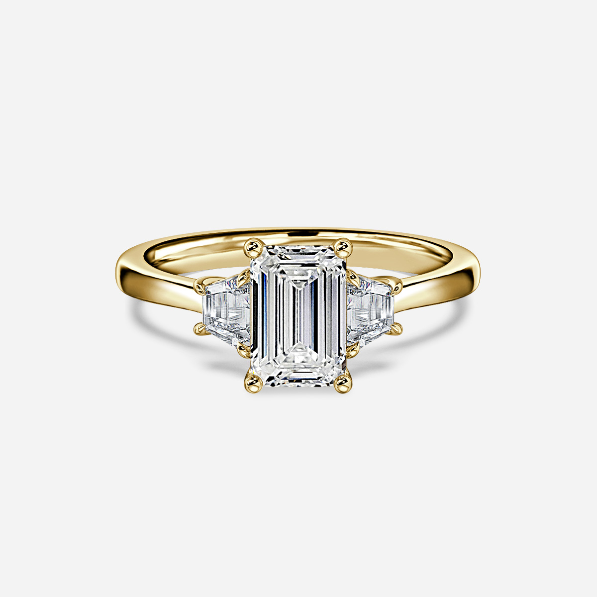 The trapezoid diamonds flanking the center diamond are very unique, their tapered shape gently guiding the eye to brilliant stone. The Treya is a testament to the enduring majesty of the trilogy style. Handcrafted in Hatton Garden, London. Centre Diamond Not Included, Setting only.