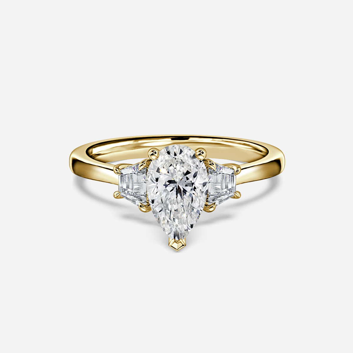 The trapezoid diamonds flanking the center diamond are very unique, their tapered shape gently guiding the eye to brilliant stone. The Treya is a testament to the enduring majesty of the trilogy style. Handcrafted in Hatton Garden, London. Centre Diamond Not Included, Setting only.