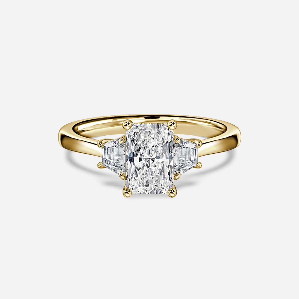 The trapezoid diamonds flanking the center diamond are very unique, their tapered shape gently guiding the eye to brilliant stone. The Treya is a testament to the enduring majesty of the trilogy style. Handcrafted in Hatton Garden, London. Centre Diamond Not Included, Setting only.