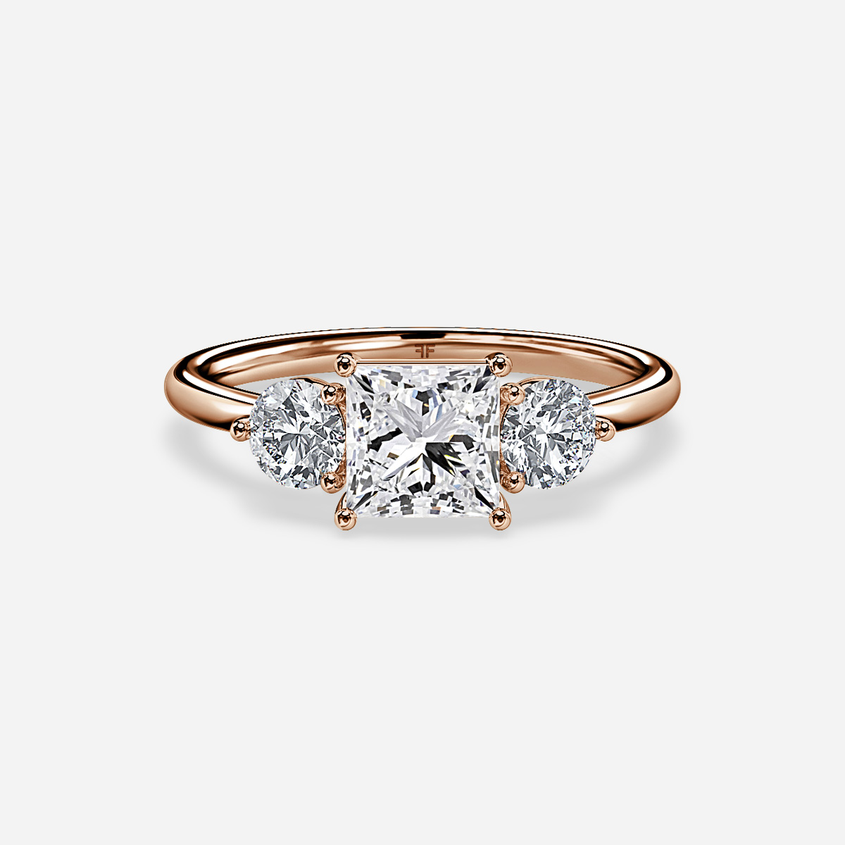 This rose gold three Stone trinity engagement ring set in eagle claws is a sure stunner. This ring features two exquisite side stone round diamonds that enhance the centre stone, telling the past, present and future tale of your relationship. Handcrafted in Hatton Gardens, London. Centre Diamond Not Included Setting only